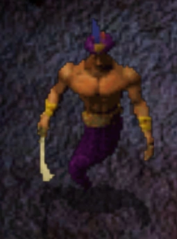 Aataqah is a djinni who is discovered in a cavern of crystals, minerals and strange pools on the first floor of Irenicus's Dungeon.