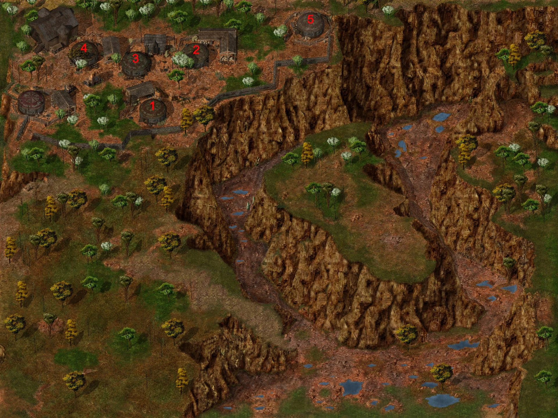 This is the house out to the far right of the village and it is completely surrounded by a wooden fence with an open gate. The front door faces towards the rest of the village.