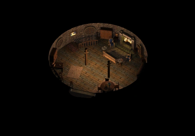 The ground floor is unpopulated. The armoire to the left of the front door is empty. The armoire near the stairs is locked(40) and contains a Sling +1 and 10