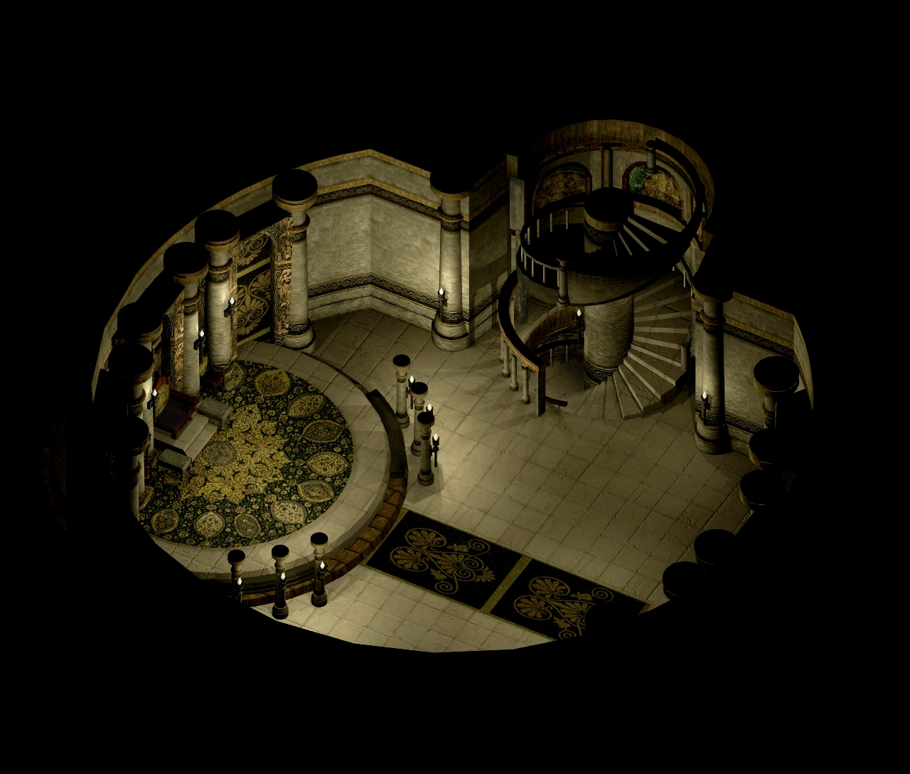 A moderately sized chamber with an ornate staircase on one side, with steps descending to Castle Saradush First Floor and steps ascending to Saradush proper. Several pillars and stone columns with decorative details support a high ceiling. Lit glass sconces illuminate the room and send warm light to reflect from the elaborate gold-laced mosaics on the walls and floor. A dais is raised on one side of the chamber with a marble throne, draped with velvet cushioning. It is a regal setting.