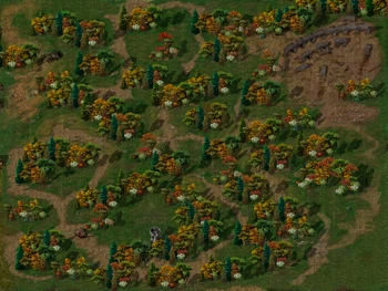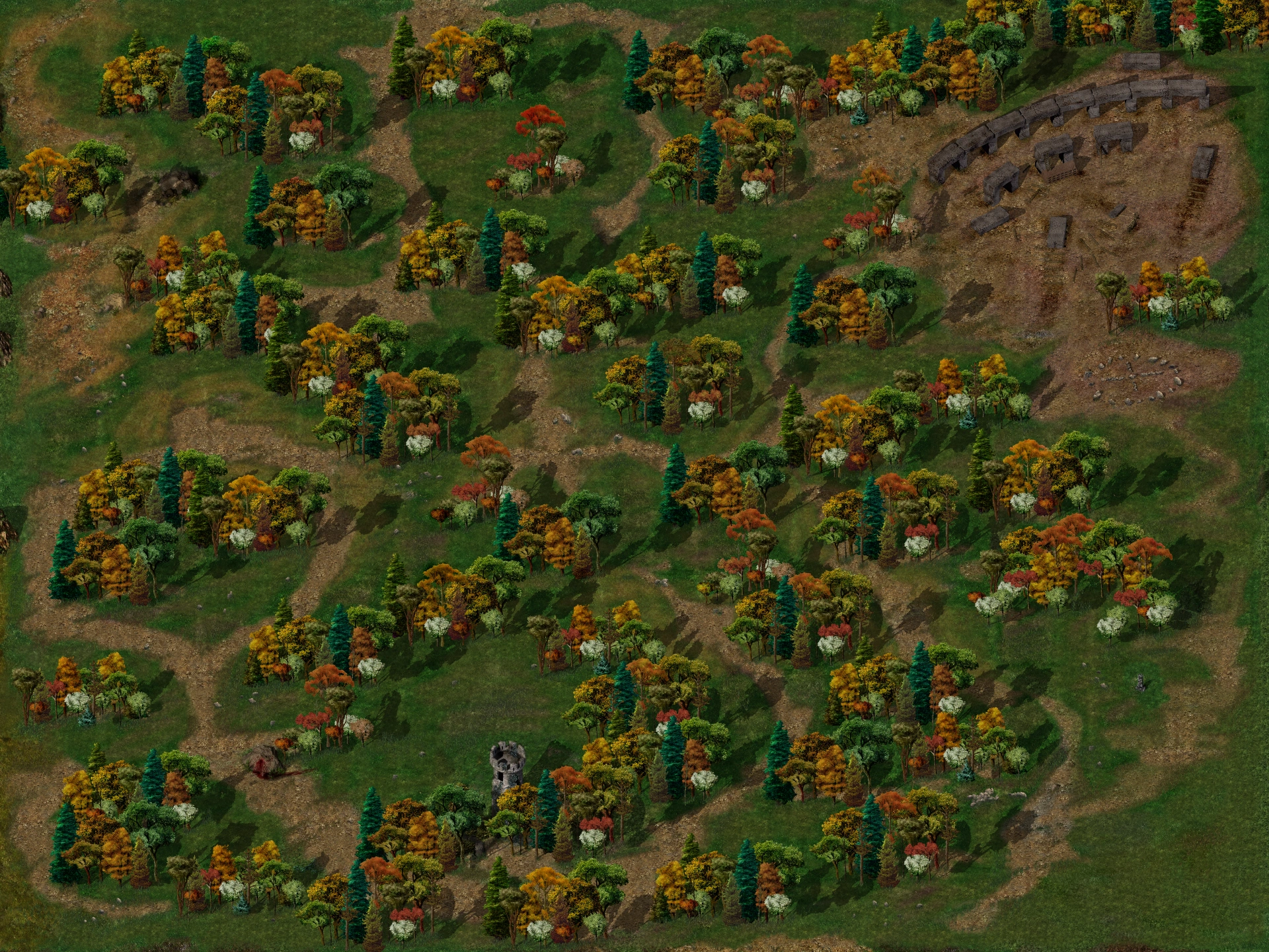 Larswood (aka Wood of Sharp Teeth) points of interest include the abandoned tower south, and the druid shrine which is under construction in the northeast.