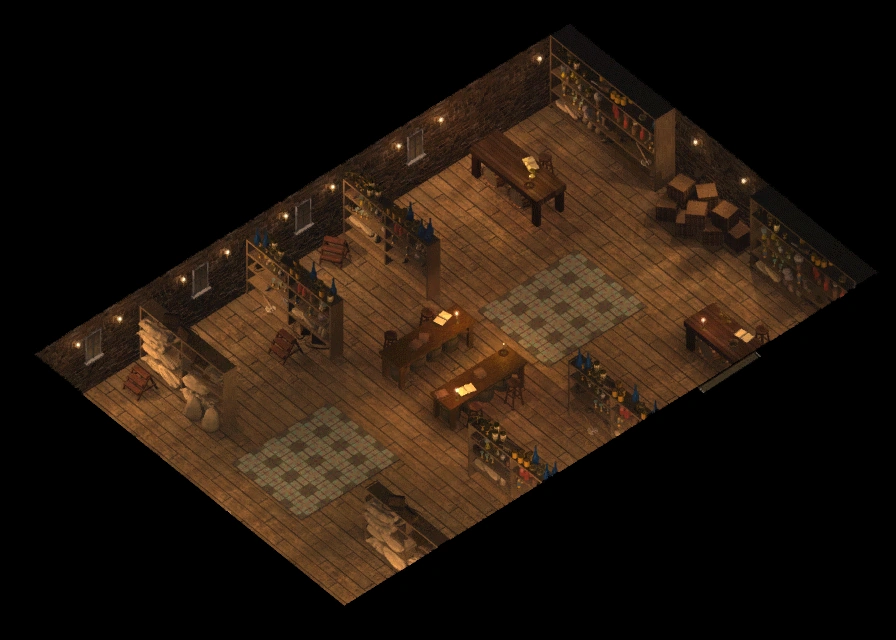 The shop is a single-floor building with generic store furniture, such as shelves and tables, that divide the single room, break line of sight, and create smaller sections. The storekeep awaits his customers near the door. The shelves in this shop are bare, as the shop itself lacks customers. Whether the odd murkiness of some of the potions the merchant sells is the reason for the latter, remains unclear.