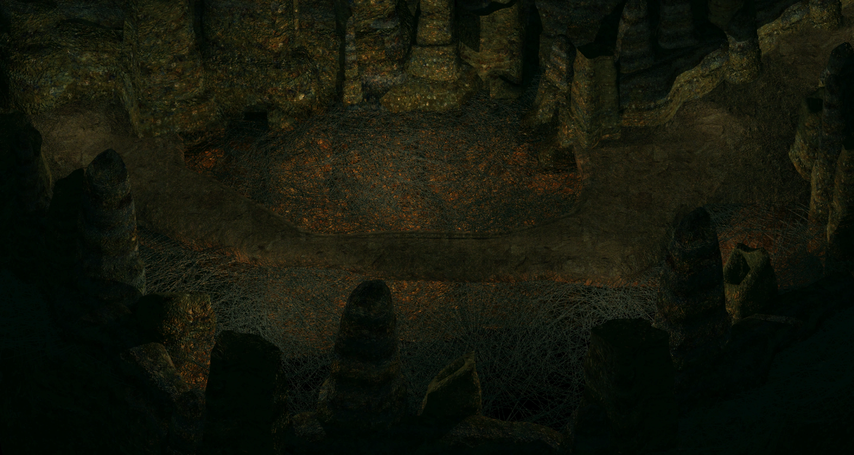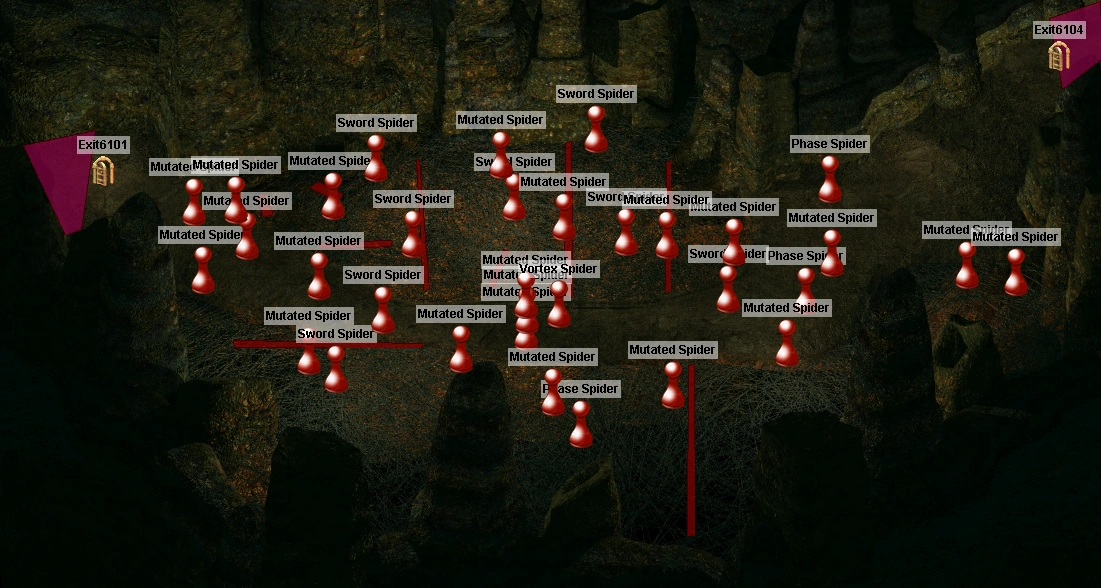 This area is populated by spiders and the sides of the tunnel are trapped. All traps cause Paralyze and Web effect unless a save vs Spells is made with a -2 penalty.