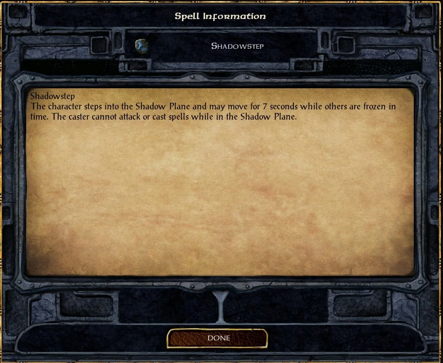 The character steps into the Shadow Plane and may move for 7 seconds while others are frozen in time. The caster cannot attack or cast spells while in the Shadow Plane. This counts as a level 0 ability. Only Shadowdancers can use it as an innate ability, but other characters can utilize this via the Rod of Shadowstep.