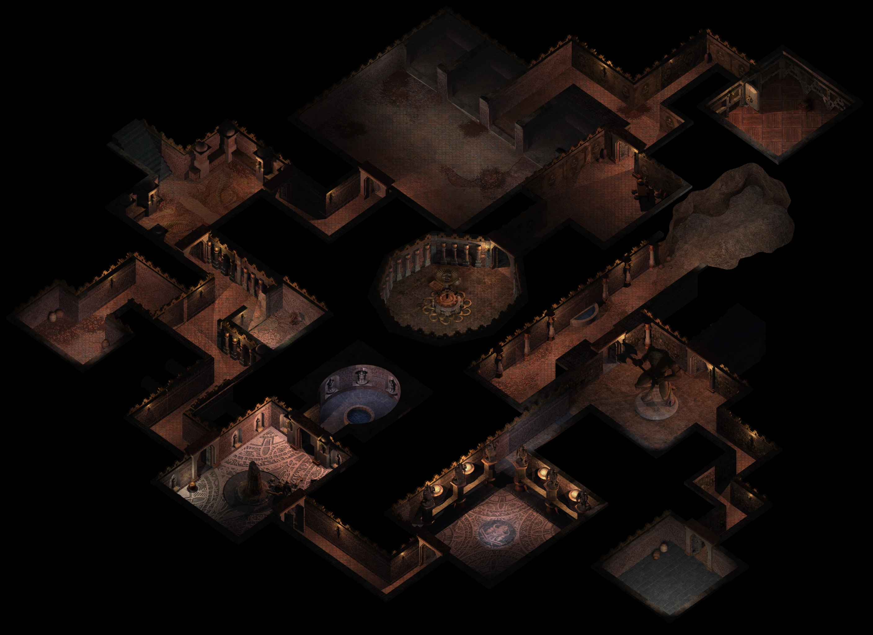 The level is fully constructed of stone blocks, doors, ornamental artwork, tiled floor areas, and elaborate torch illumination consisting of braziers/sconces. Incredible statues, many with magical auras and abilities are present. Additionally, there are storerooms as well.