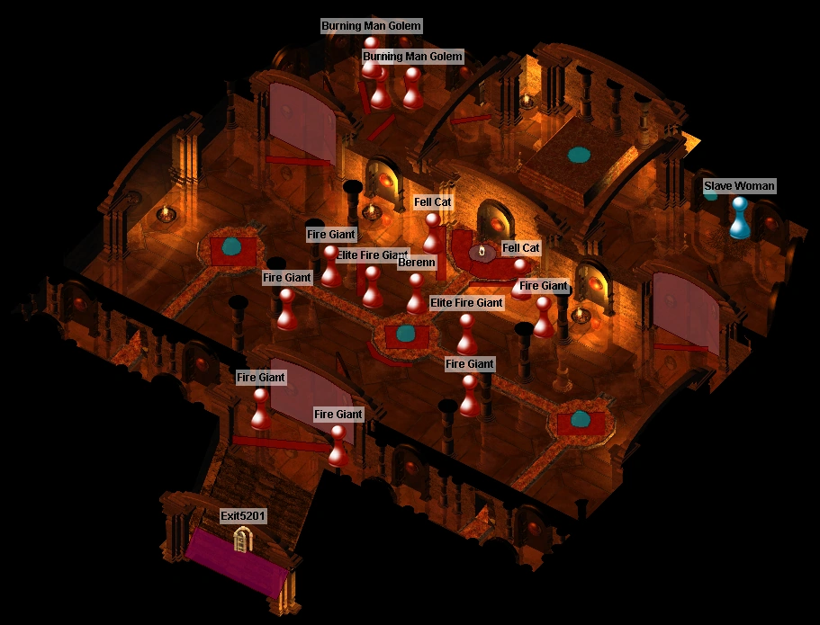 Installation of Sword Coast Stratagems Mod and the "Improved Fire Giant Lair" component adds changes. Fire giants become Berserkers, and will get HLAs on higher difficulties. Flaming Skulls become tougher and get access to Stoneskin and more powerful fireballs, and Burning Men get a dispel-magic attack; both get a smarter script. One of the groups of fire creatures behind the force fields is replaced by a group of Efreeti and a Fire Lich (a creature removed from the original game). Imix becomes tougher and gets a Greater Whirlwind ability. A red dragon of about Firkraag's strength joins the giants in the inner temple.